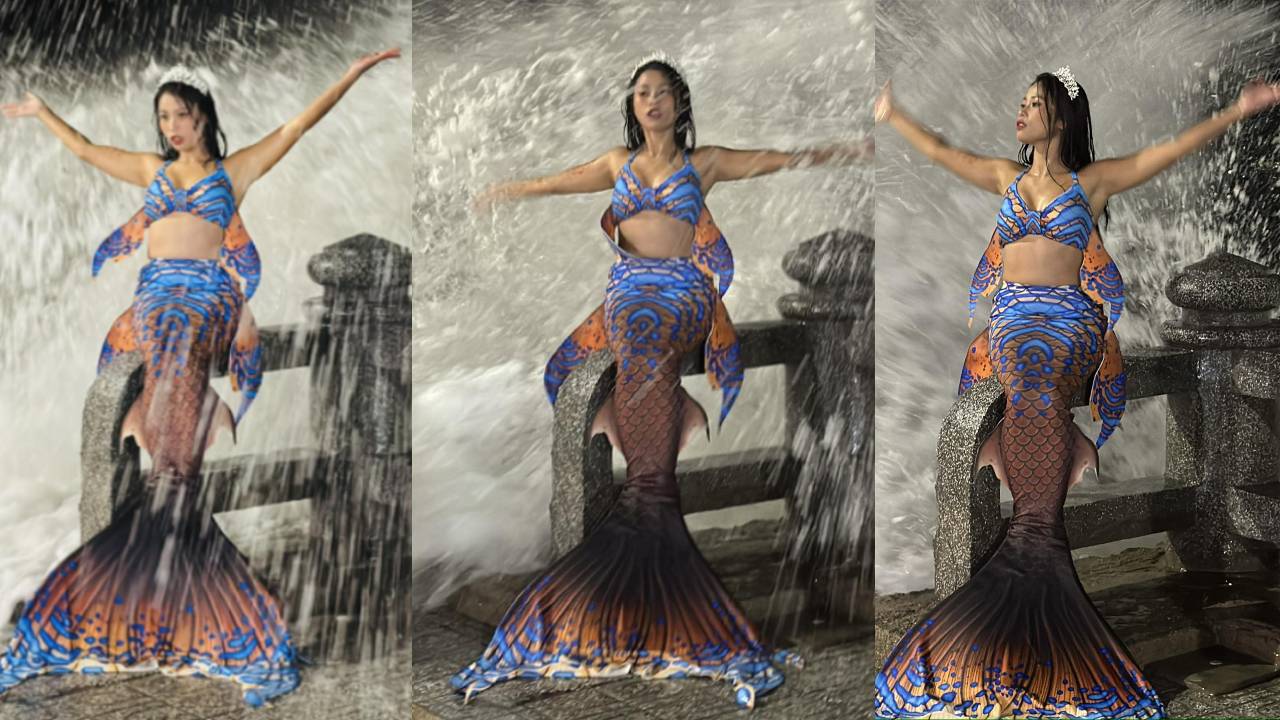 Đoạn video lan truyền gần đây cho thấy một cô gái trẻ trong trang phục nàng tiên cá lộng lẫy, với chiếc đuôi cá lấp lánh, đang tạo dáng đầy uyển chuyển giữa thời điểm sóng bão đánh mạnh vào bờ. Vẻ mặt cô gái vô cùng phấn khích, người quay video, chụp ảnh cho cô nàng không ngừng khen cô gái đổi kiểu dáng khác nhau để bắt trọn những khoảnh khắc ấn tượng.