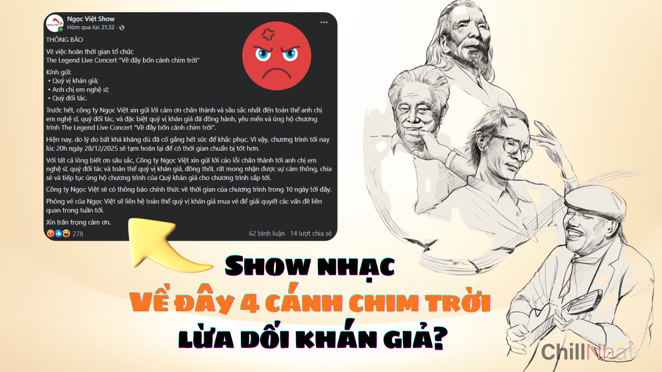 Những ngày cuối năm, cộng đồng mạng không khỏi phẫn nộ trước thông tin show nhạc Về đây 4 cánh chim trời lừa dối khán giả. Dù được quảng bá rầm rộ là đêm nhạc tôn vinh những tượng đài của nền âm nhạc Việt Nam, nhưng chương trình lại bất ngờ hủy show ngay sát giờ G. Sự việc khiến hàng nghìn người hâm mộ cảm thấy bức xúc và bị xem thường. Vậy thực hư câu chuyện như thế nào? Hãy cùng Chillnhat.me tìm hiểu ngay nhé!